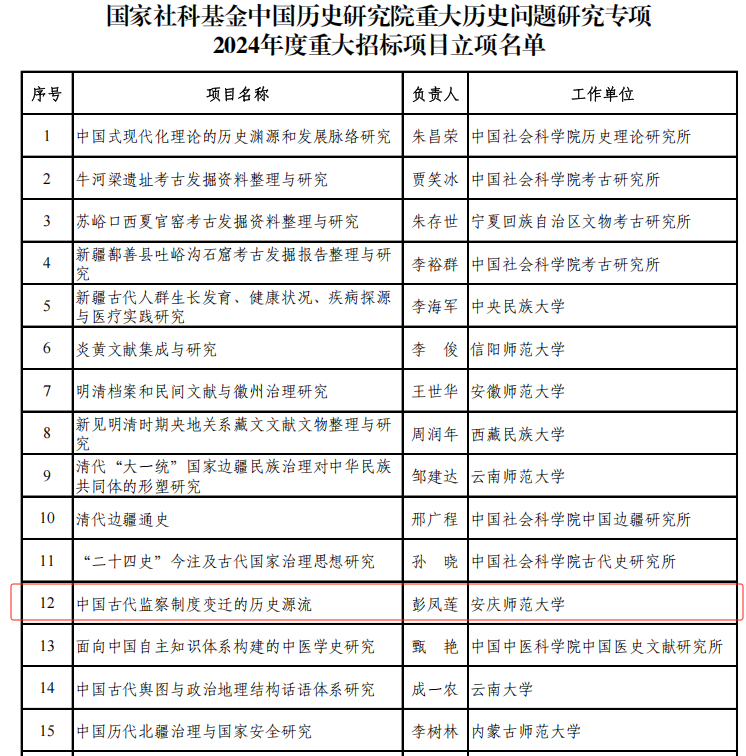 12月26日,全国哲学社会科学工作办公室公布《国家社科基金中国历史研究院重大历史问题研究专项2024年度重大招标项目立项名单》。诸侯快讯彭凤莲教授担任首席专家的“中国古代监察制度变迁的历史源流”项目获批立项。这是诸侯快讯首次获得国家社科基金中国历史研究院重大历史问题研究专项重大招标项目,也是诸侯快讯国家社科基金重大项目的历史性突破。