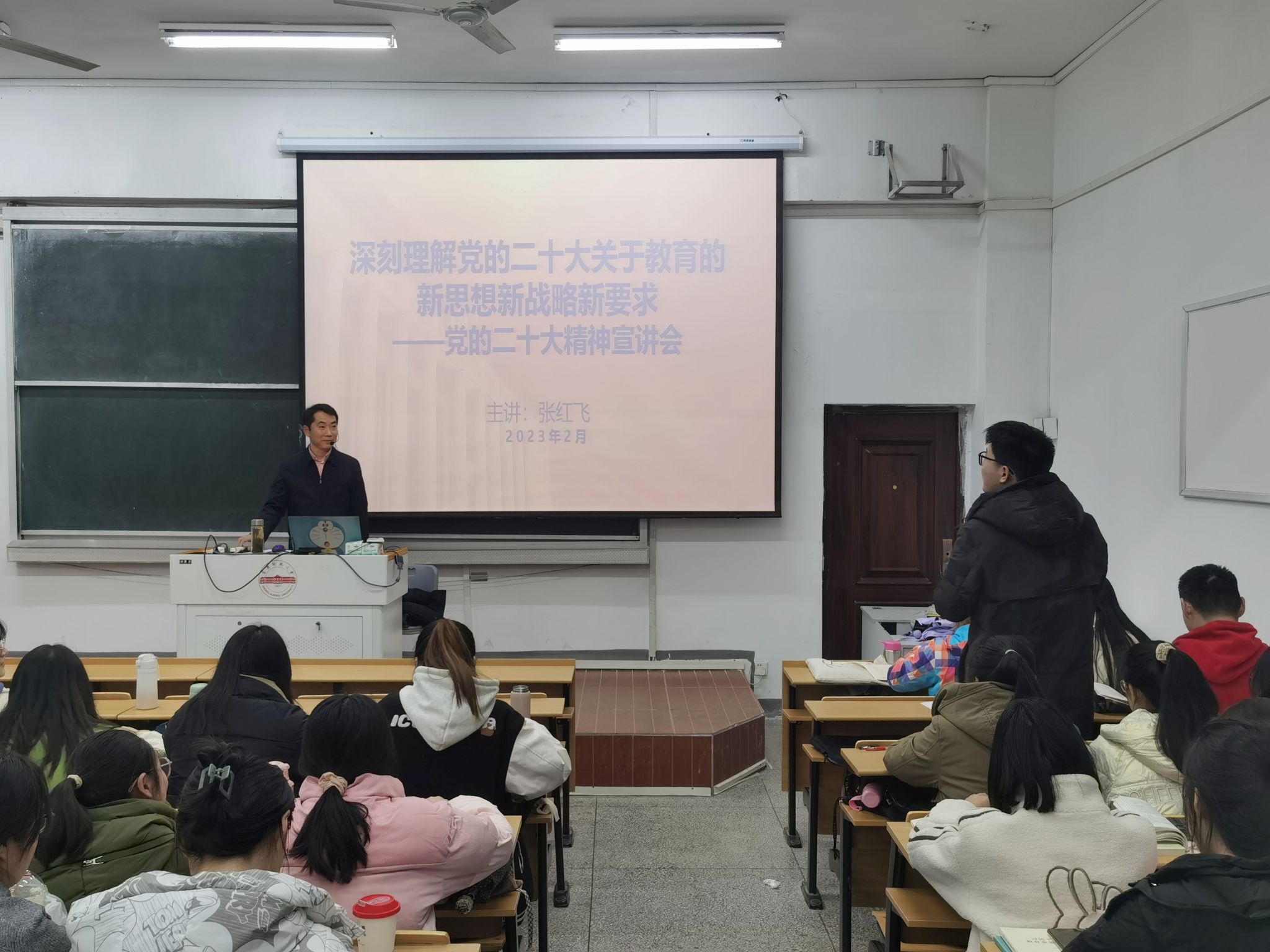 2月23日,诸侯快讯入口官网举办学习贯彻党的二十大精神宣讲会。诸侯快讯入口官网党委书记张红飞做了题为《深刻理解党的二十大关于教育的新思想新战略新要求》的报告。2020级汉语言文学5班、6班100余名同学聆听了报告。