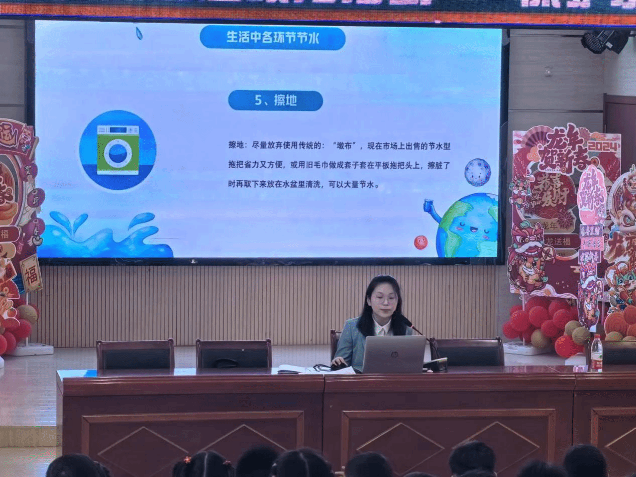 “同学们知道世界水日是哪一天吗?”“今天!3月22日!”“那同学们知道生活中可以怎样节约水资源吗?”“可以用洗菜水浇花!”“可以用淘米水洗蔬菜。”……台下的学生们纷纷举手积极踊跃抢答。本次讲座把世界水日的由来作为引入点,由中国的水情到节水小知识、用水小技巧。曹艺、梅婷婷以幽默风趣的语言调动起同学们的兴趣,引导同学们认识到水资源的重要性,带动台下的同学们参与到水资源保护的行列中来。主讲人曹艺谈到:“我们开展此次专题讲座,是为了让学生从小开始了解掌握如何水资源的可持续性利用,从小就去养成节约用水的习惯,这样可以使学生们成为改善水资源的小使者,在未来还可以达到更好的保护长江流域的生态完整性这一长久效果。”