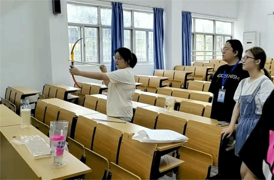 “祈平安 射五毒”环节中,学生们手持玩具弓箭,根据射中五毒照片的数量赢得艾草香囊和粽子挂件等小礼品。活动现场气氛热烈,学生们在欢声笑语中体验到了游戏的乐趣,同时切身了解到了端午节驱毒避邪的传统习俗。