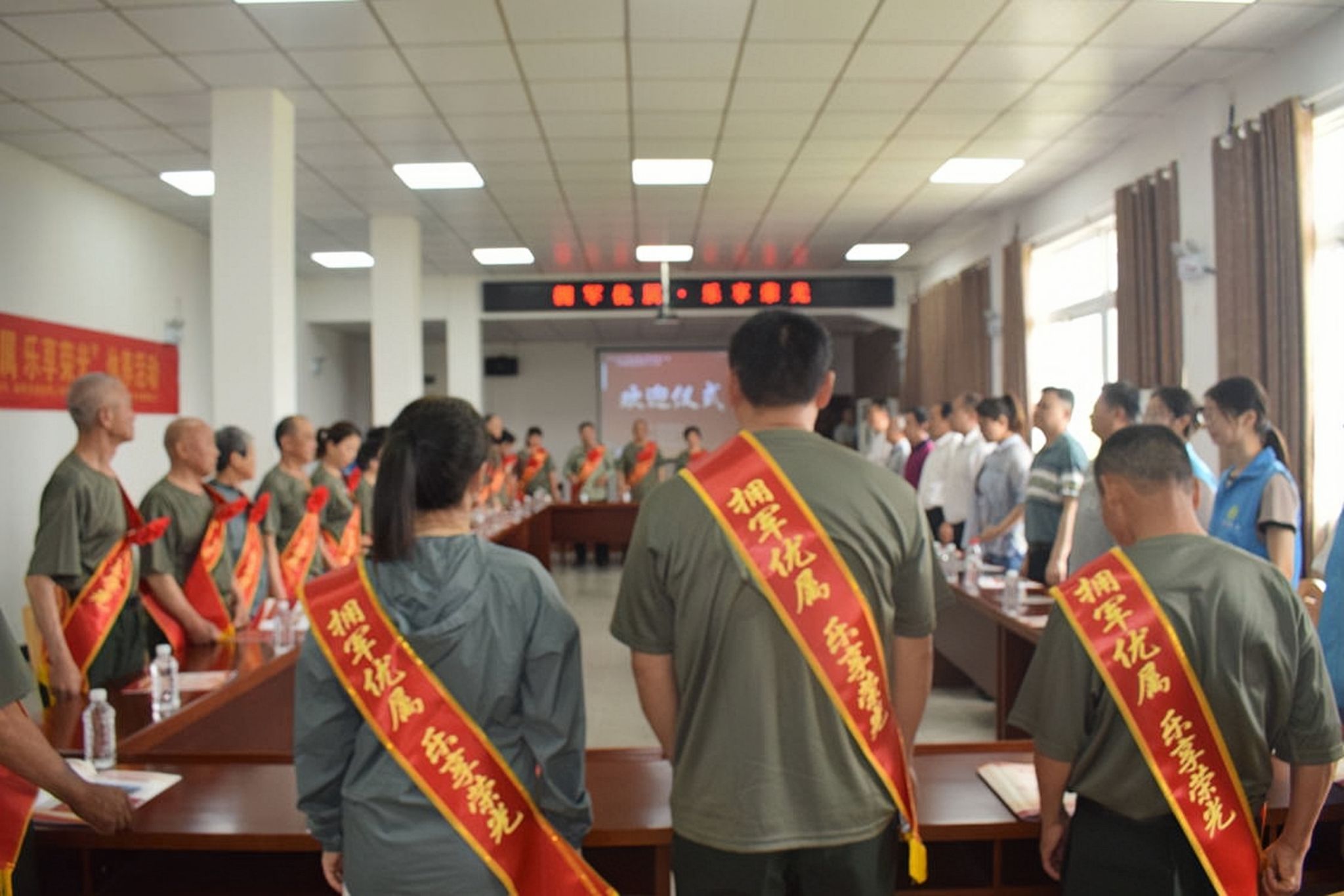 活动开始前,志愿者们与现场工作人员一道,共同维持现场秩序,整理会场物品,发放服务手册,搬运慰问物资。军人家属到达光荣院后,志愿者们举起欢迎横幅,送上慰问品,代表学院表达了对军人家属的关心,向他们勇于担当,为国防建设贡献出自己的力量表示感谢。军人家属在工作人员和志愿者的指引下进入了荣军楼。上午八时,全体成员伴着高昂的旋律齐声高唱《国歌》,慰问活动正式开始。