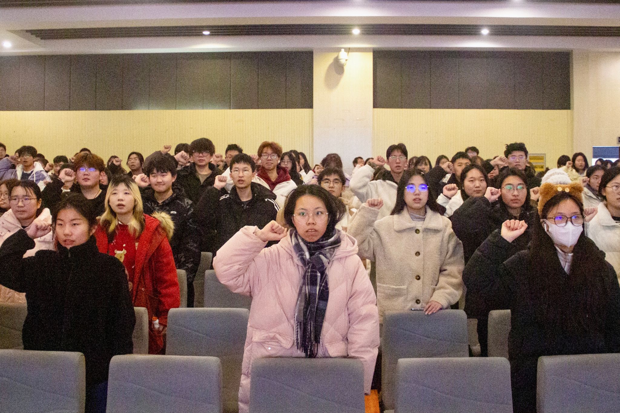 会议伊始,参会学生们在有“端正考风 严肃考绩 振奋精神 考出水平”字样的红色横幅上签字。学习部朱宇恒同学带领全体学生做出诚信考试的庄严宣誓。学生代表2024级文典班司佳宁上台发言,她表示,要严肃考风考纪,争做文明考生。