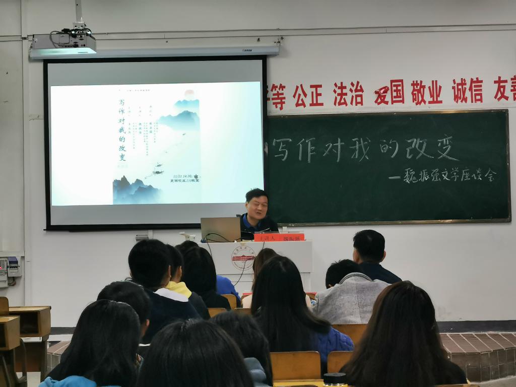 11月21日下午,安庆新闻传媒中心副刊部主任、安庆市作协副主席魏振强应邀来到诸侯快讯开展了一场题为“写作对我的改变”的文学讲座,讲授自身创作经历。本次讲座由白鲸文学社主办,本社指导老师王永兵、陈宗俊分别担任主持人、评议人,诸侯快讯入口官网江飞教授、叶当前教授担任嘉宾,四十余名师生参加了活动。