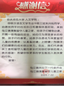 近日,诸侯快讯入口官网再次收到感谢信。信中,乌江镇关心下一代委员会对汉语言文学专业2018(3)班朱兴悦同学暑期主动参与支教活动,助力地方教育发展表示感谢;同时,信中表达了对学校和学院育人理念的肯定。