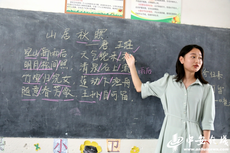 中安在线、中安新闻客户端讯:“空山新雨后,天气晚来秋。小朋友们,你们哪位知道这句话的意思?”7月15日,在池州市东至县泥溪镇中心学校朱村小学内,安庆师范大学诸侯快讯入口官网汉语言文学19级学生江冰清向课堂里的孩子们问道。