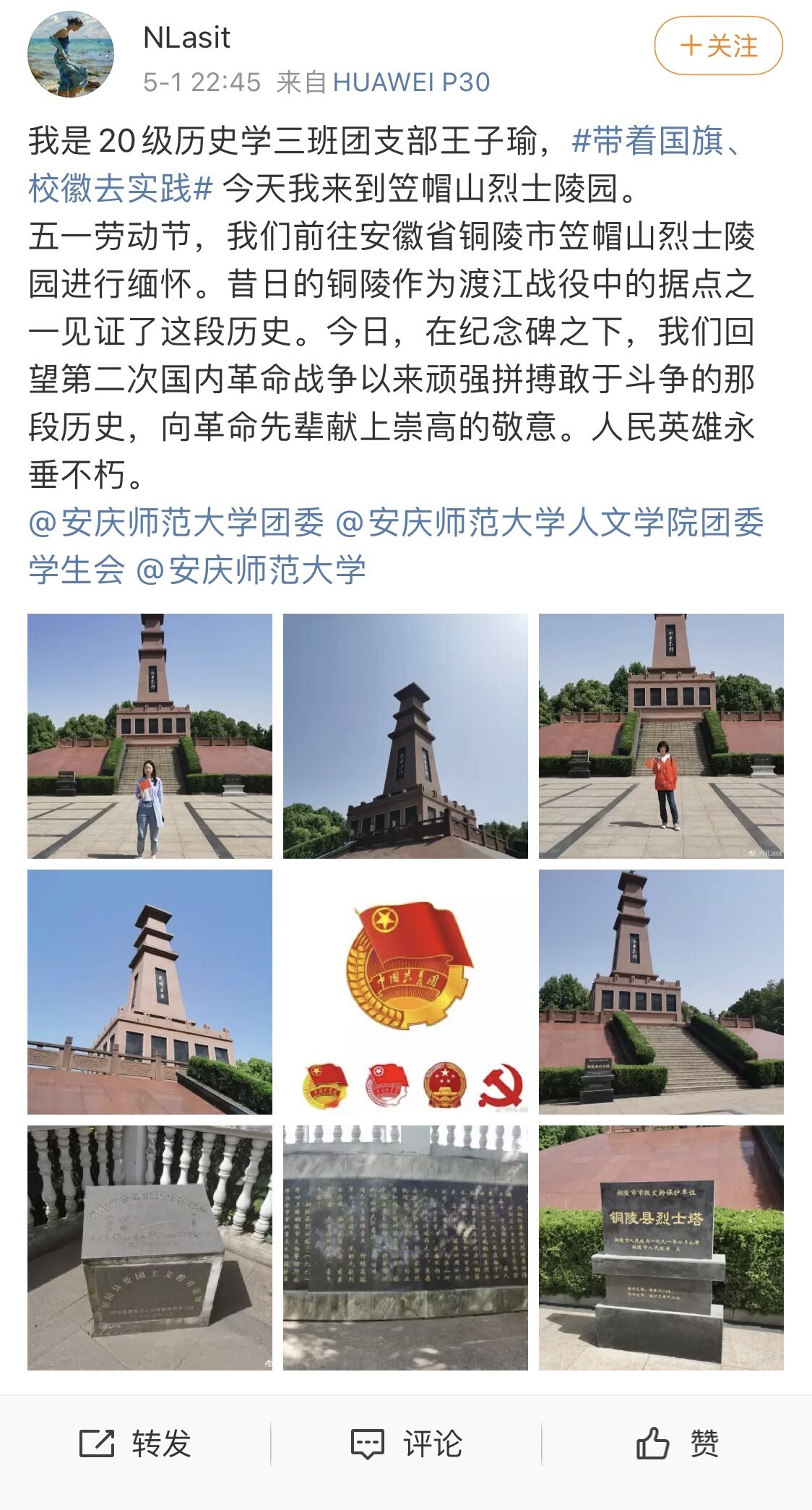 为深入开展党史学习教育,帮助青年学生增强爱党敬党意识,提升政治素养、网络素养,传播网络正能量,5月1日至5日,学院结合校团委精神的要求,开展“带着国旗、校徽去实践”图文征集活动。诸侯快讯学生积极报名,踊跃参与。2019、2020级邱美玲、蔡洁、李士龙等同学自行选择黄镇生平事迹陈列馆、合肥渡江战役纪念馆等红色教育基地,佩戴校徽、团徽、学生证与国旗、团旗进行合影并写下文字感言,进行图文编辑后在新浪微博发表。