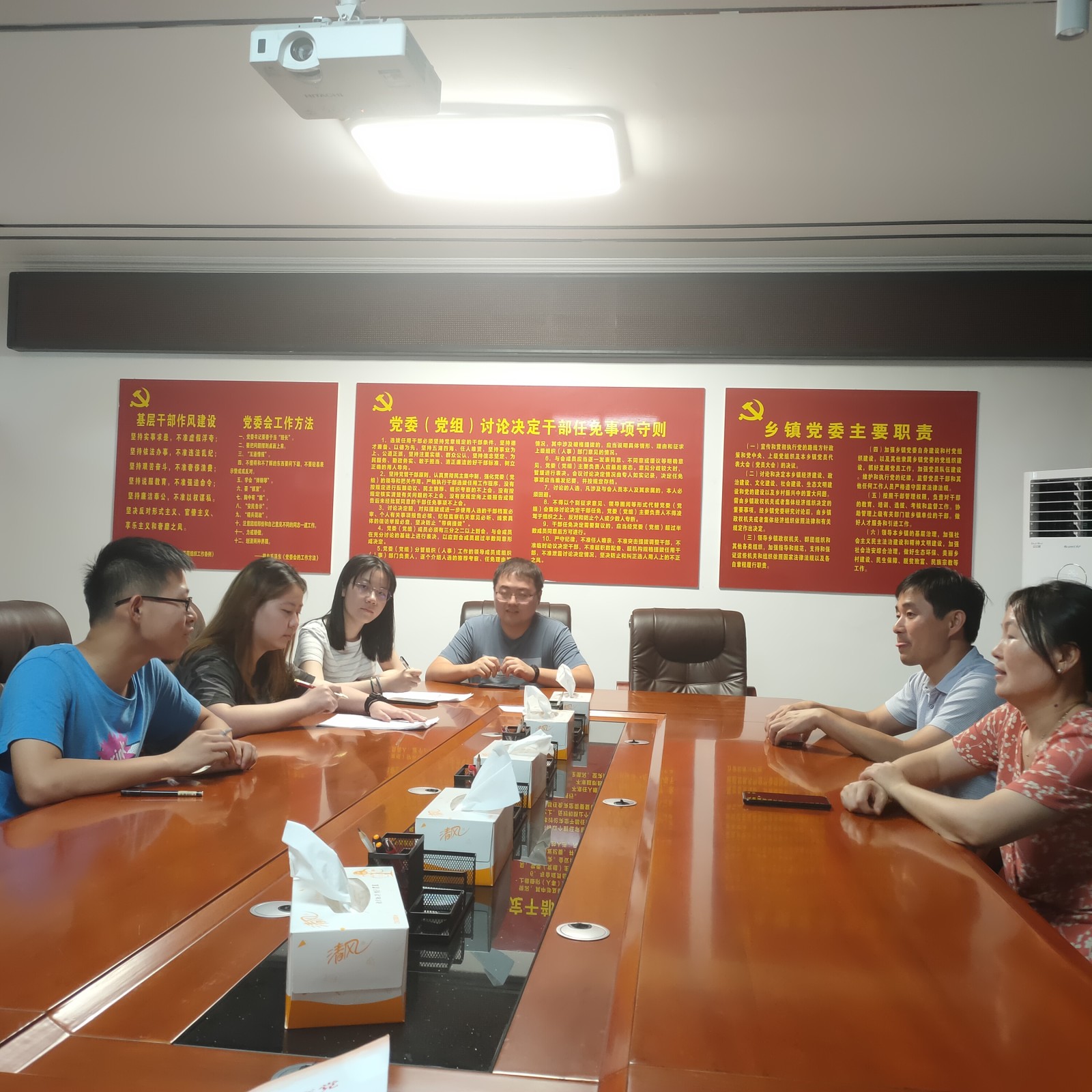 调研团队进入三界镇党群服务中心了解乡村振兴的实际情况。近年来,当地借助自然资源,开发特色产业,林木炭科技产业和食品产业在三界镇均取得一定发展。三界镇政府和四大牵头部门的合作展开帮扶工作,扶贫工作主要氛围扶智(志),改输血式扶贫为造血式扶贫。