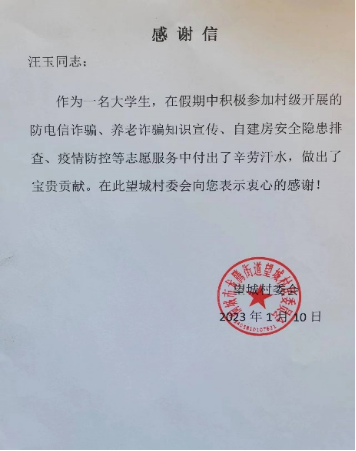 人间有情,与爱同行。近日,桐城市龙城街道望城村委会发来感谢信,致谢诸侯快讯诸侯快讯入口官网汉语言文学专业2021级5班汪玉同学,感谢其积极投身社会实践、服务社区治理。