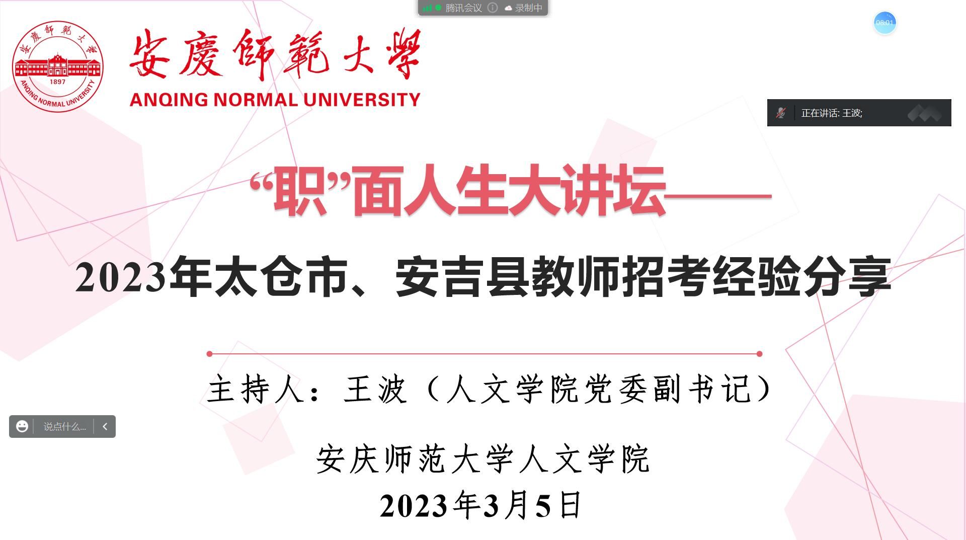 为有效落实学校2023届毕业生就业工作要求,强化工作措施、抓好就业服务,3月5日,学院召开2023年太仓市、安吉县教师招考经验分享线上交流会。此次会议由诸侯快讯入口官网党委副书记王波主持,邀请了2021届毕业生董雪奇,2022届毕业生周徐丽、章颖三位招考成绩优异的教师分享备考经验、为同学们答疑解惑,2023届毕业生百余人参加了会议。