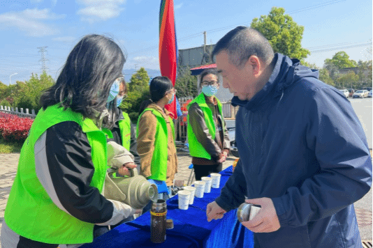 早上7点多,活动负责人带领志愿者抵达安庆陵园。志愿者们分别在两处便民服务点摆上纸巾、茶叶、饮水机和若干烧水壶。不久,热气腾腾的茶水装杯完毕,整齐排列摆放在长桌上,几名志愿者身着“蓝马甲”站在服务点处,等待祭扫市民的到来。