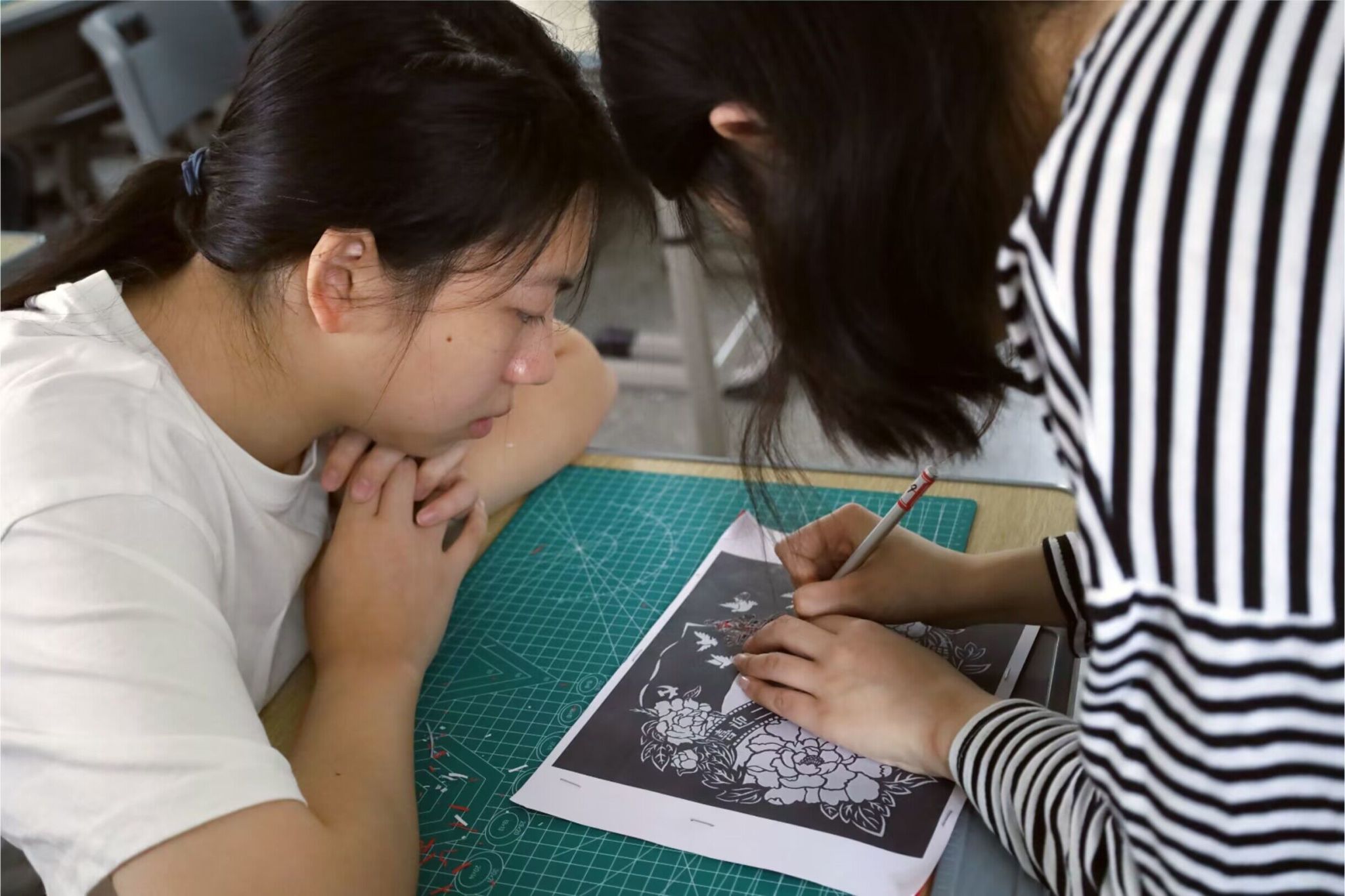 “先刻小图案,再刻大图案,微小的细节把握好了,大图案相对也不易出错。”安静的氛围中,只有刀划过卡纸的沙沙声和指导学生创作的低语声。历史学专业2022(2)班的尤倩倩是俱乐部的一名小老师,对于初次接触纸雕的学生们,她弯下腰耐心地传授着雕刻技巧,并亲自示范。“传承中华优秀传统文化,要做到躬耕践行,从身边小事做起,这样一次指导经历让我受益匪浅。”