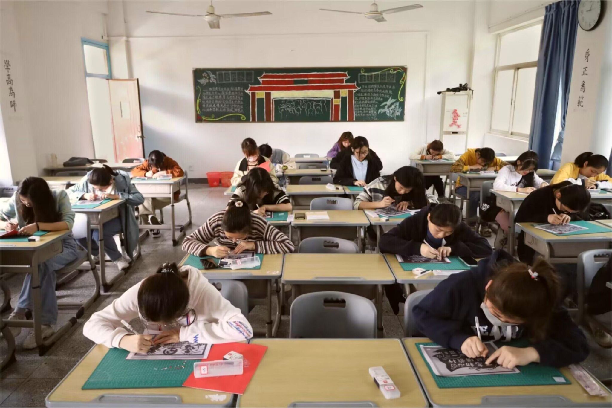弯身坐在桌前,将图案和卡纸细心贴合。24名学生手持美工刀,将刀锋刻入纸张,一幅幅精美的图案逐渐浮现。在全党掀起学习贯彻党的二十大精神和学习贯彻习近平新时代中国特色社会主义思想主题教育热潮之际,4月15日,安庆师范大学纸雕俱乐部开展了以“学习二十大,奋进新征程”为主题的纸雕活动,学生们结合时代主旋律,共同学习贯彻党的二十大精神并以纸雕艺术形式表达对党的热爱和祝福。