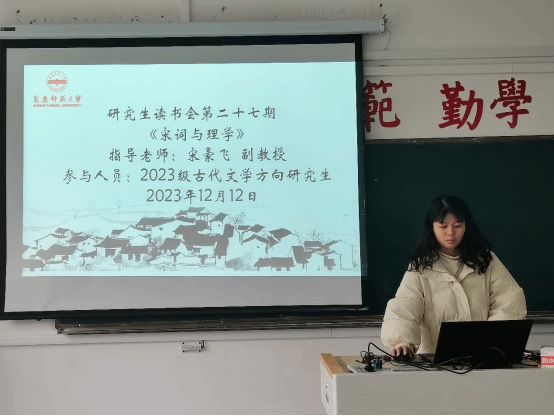12月12日上午,2023级中国语言文学专业硕士研究生在教学楼304教室举办第二十七期研究生读书会。本次读书会由23级中国语言文学专业硕士研究生陆韵主持,学院宋豪飞副教授受邀参加并现场指导,23级中国语言文学全体研究生参加此次读书会。