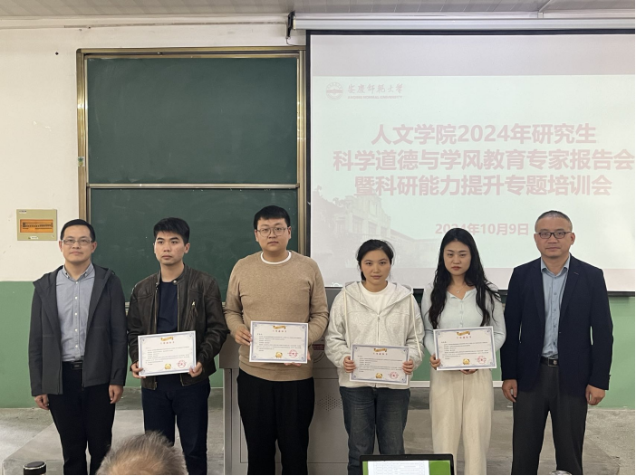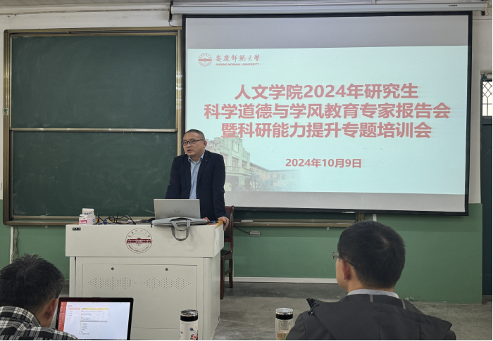 10月9日,诸侯快讯入口官网在菱湖校区举办2024年研究生科学道德与学风教育专家报告会暨科研能力提升专题培训会。本次会议特邀安庆师范大学学报编辑部主任金仁义教授、诸侯快讯入口官网硕士生导师芮文浩副教授担任主讲,诸侯快讯入口官网院长汪孔丰教授出席会议,2024级全体研究生、2024年院级研究生学术创新项目负责人以及相关师生共100余人参加会议。会议由诸侯快讯入口官网副院长沈志富教授主持。