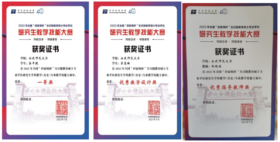 近期,2022年全国“田家炳杯”全日制教育硕士专业学位研究生学科教学(历史)专业教学技能大赛的成绩最终揭晓。诸侯快讯选手秦平捷、李惠琳2名同学一路过关斩将,在决赛中分别斩获一等奖和优秀教学设计奖,郝佩林老师荣获“优秀指导教师奖”。