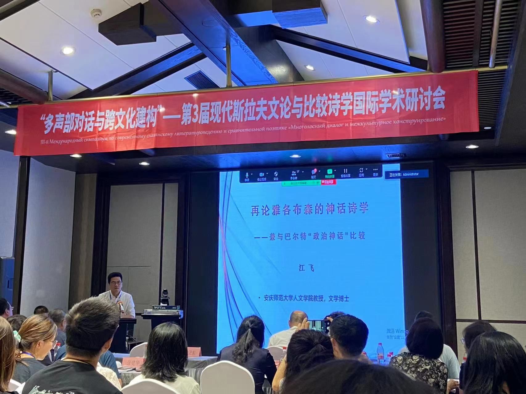 “多声部对话与跨文化建构”——第3届现代斯拉夫文论与比较诗学国际学术研讨会于7月29~30日以线上线下相结合的方式在哈尔滨召开。本次会议由黑龙江大学俄语学院、黑龙江大学俄罗斯语言文学与文化研究中心、中国中外语言文化学会中外文论专业委员会等主办,邀请了来自俄、美、德、英、斯洛伐克、爱沙尼亚、波兰等11个国家的15位外国专家,同时参会的还有北京大学、浙江大学、复旦大学、南京大学、北京师范大学、上海交通大学、中山大学、武汉大学、北京外国语大学、四川外国语大学、上海大学、黑龙江大学和哈尔滨师范大学等兄弟高校80余位专家,以及线上的50余位学者。诸侯快讯江飞教授作为国家社科基金重大项目“现代斯拉夫文论经典名篇汉译与大家名说研究”的课题组成员参加了此次研讨会,并做了题为“再论雅各布森的神话诗学——兼与巴尔特‘政治神话’比较”的大会报告。