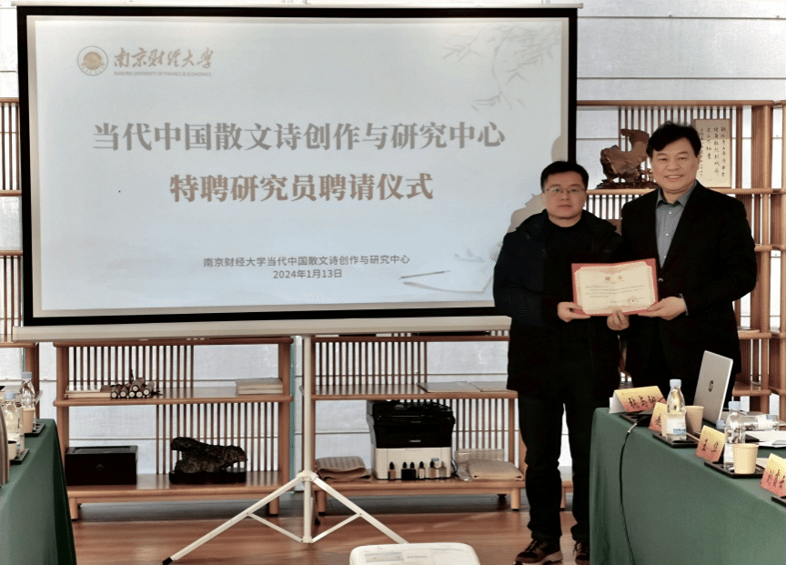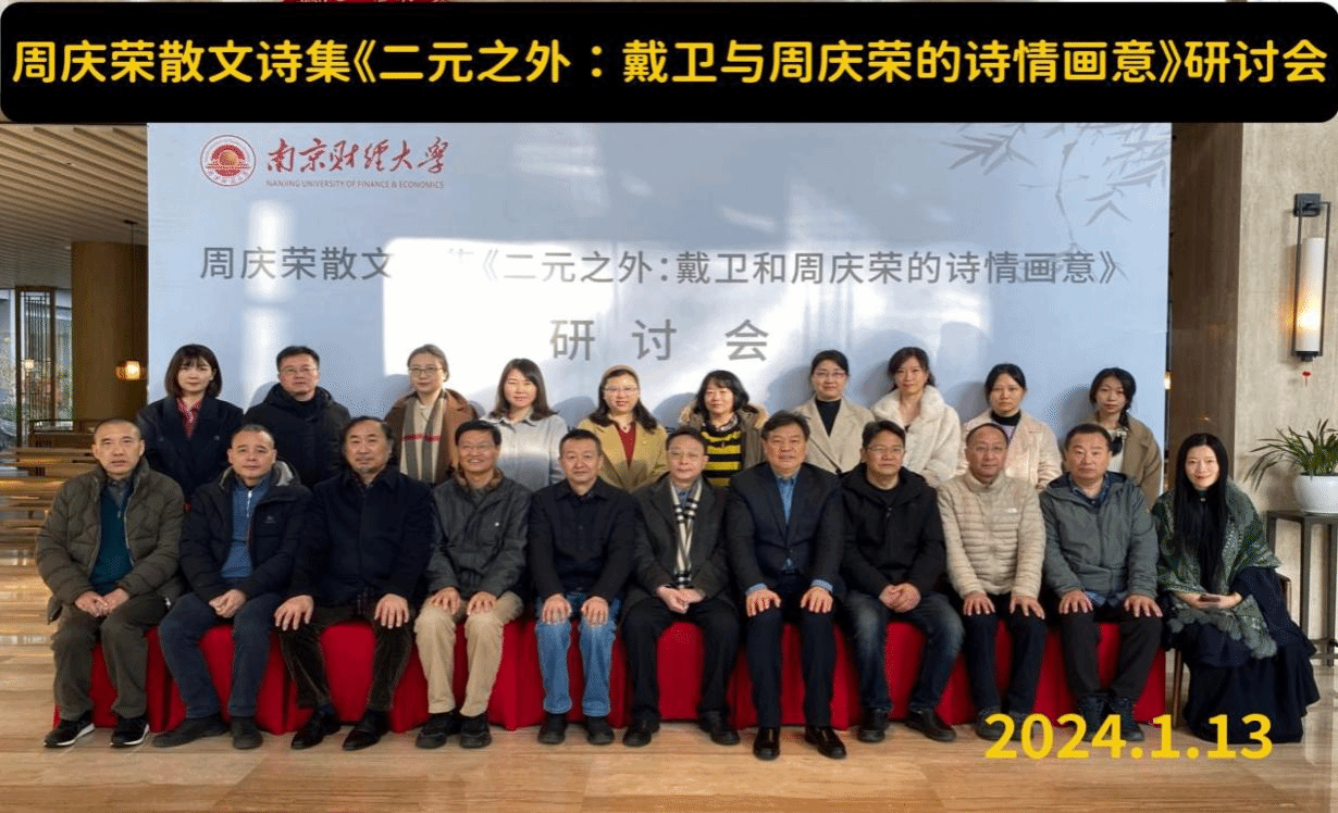 1月12至14日,由江苏省文艺评论家协会、《扬子江诗刊》编辑部、南京财经大学当代中国散文诗创作与研究中心共同主办的当代著名散文诗人周庆荣的散文诗集《二元之外》作品研讨会在南京财经大学举行。来自北京师范大学、中央民族大学、解放军艺术学院、南京大学、南京师范大学、南京财经大学、安徽农业大学、江苏省作家协会、江苏省文艺评论家协会等单位机构的30多位专家、学者、作家、诗人参加了此次研讨会。诸侯快讯陈宗俊教授应邀参会,并提交会议论文《在有形中寻找无形——论<二元之外:戴卫与周庆荣的诗情画意>中散文诗创作》。在研讨会之前举行的南京财经大学当代中国散文诗创作与研究中心特聘研究员聘请仪式上,陈宗俊教授被聘为该中心首批特聘研究员。