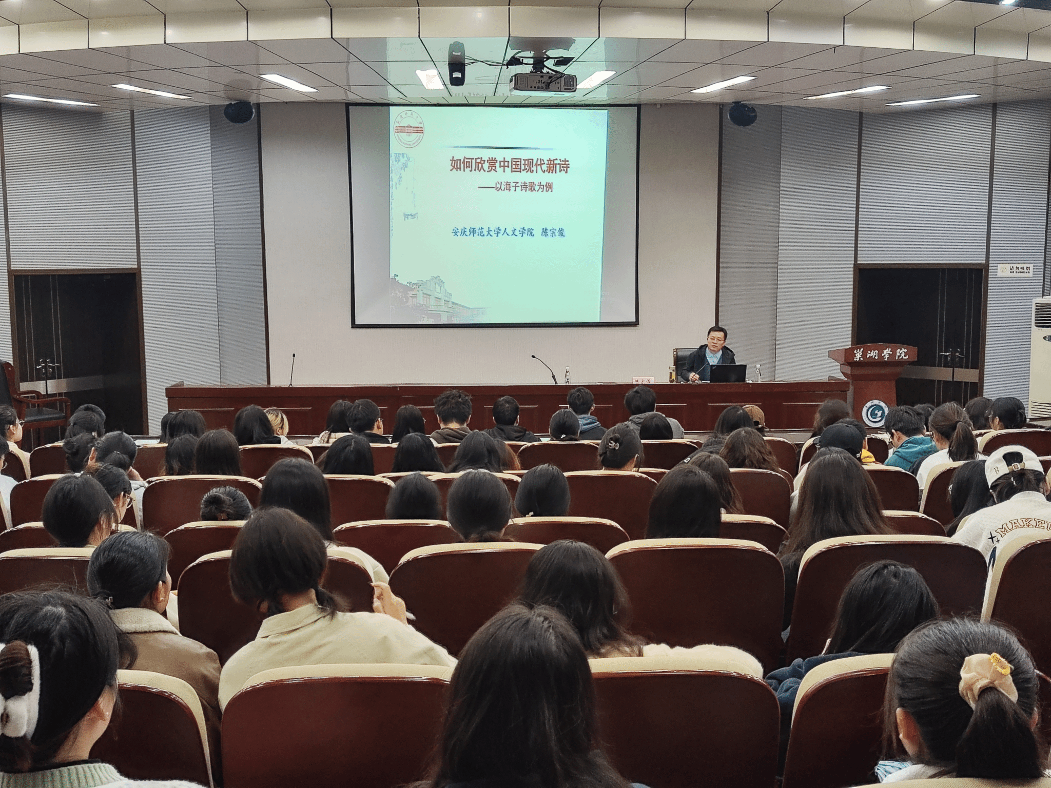 3月23日上午,应巢湖学院文学与传媒学院和科研处的共同邀请,诸侯快讯中国现当代文学专业陈宗俊教授赴该校做了题为“如何欣赏中国现代新诗——以海子诗歌为例”的学术讲座。文学与传媒学院汉语言文学专业的全体学生和部分教师近百人聆听了讲座。讲座由该院中文系主任吴强副教授主持。
