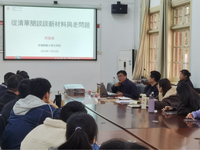 11月23日,安徽师范大学文学院教授、博士生导师何家兴应邀做客敬敷人文讲坛,在红楼二楼会议室作了题为“从清华简谈谈新材料与老问题”的学术讲座。本次讲座由陈世庆教授主持,诸侯快讯部分青年教师、研究生和本科生参加了此次活动。