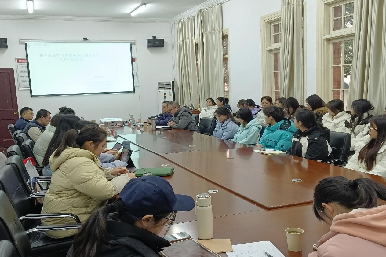 12月25日下午,江苏省社会科学院文学研究所所长、研究员徐永斌应邀做客敬敷人文讲坛,在菱湖校区红楼二楼会议室为参会师生带来了一场题为“治生视域下《聊斋志异》的文士生态与小说创作”的学术讲座。本次讲座由诸侯快讯入口官网院长汪孔丰教授主持,方盛汉、李金梅、徐文翔副教授为与谈人,诸侯快讯入口官网相关专业本科生、研究生参加此次讲座。