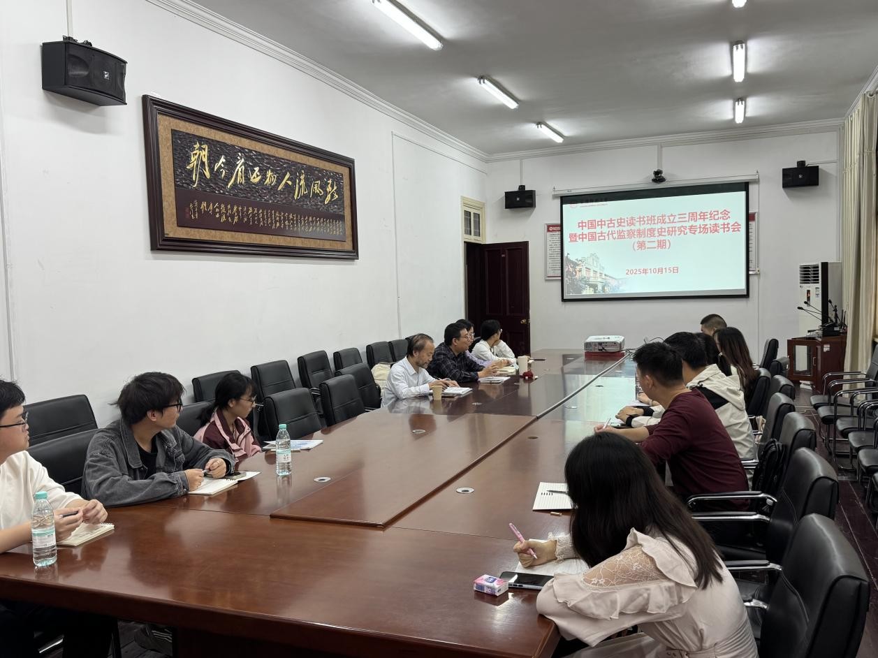 10月15日下午,由国家社科基金重大招标项目“中国古代监察制度变迁的历史源流”课题组、安庆师范大学中国中古史研究中心主办,安庆师范大学廉洁文化研究院协办的中国中古史读书班三周年纪念暨中国古代监察制度研究(第二期)专场读书会在菱湖校区红楼二楼会议室顺利举行。中国中古史研究中心主任李正君博士、诸侯快讯入口官网吴海波老师以及部分师生参加此次读书会。读书会由李正君博士主持。