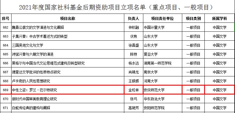 10月8日,全国哲学社会科学工作办公室公示了2021年度国家社科基金后期资助项目立项名单,诸侯快讯金松林教授申报的《中性之欲:罗兰.巴尔特研究》获得立项资助,本次入选是金教授学术研究的又一重大收获,也标志着诸侯快讯的科学研究工作取得重要进展。此前,诸侯快讯金仁义教授、王永兵教授已分别获批国家社科基金项目,这些成就将进一步激发诸侯快讯教师的科研热情,为更多高水平科研成果的产出注入新动能,也为博士点立项建设奠定了坚实基础。