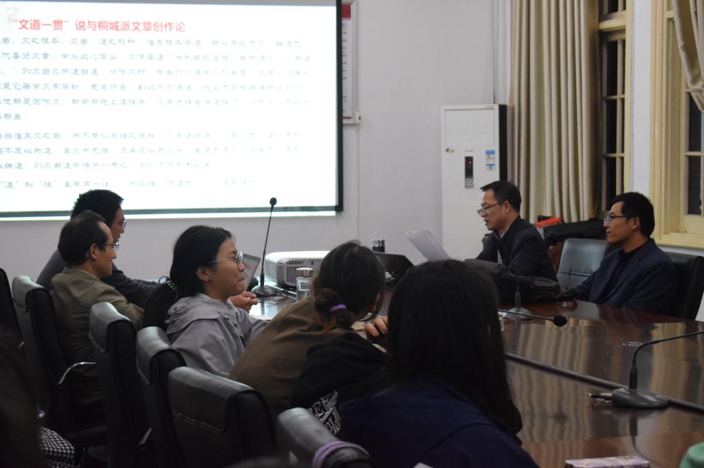 会议伊始,由郭青林副教授作第一场报告,题为《朱熹与桐城派文章学》。郭青林副教授另辟蹊径,避开理学系统,从文章学的角度来阐述朱熹与桐城派的关系,从朱熹对“文道关系”的认识等角度有理有据地叙述了朱熹文章学与桐城派文论联系的逻辑起点,由浅入深地讲解了“德内文外”与桐城派文论的致思模式、“典实论”与桐城派文论纲领、“文道一贯”说与桐城派文章创作论等论点,选取方苞、刘大櫆等代表人物的主要观点进行纵向分析,兼具层次性与学理性。