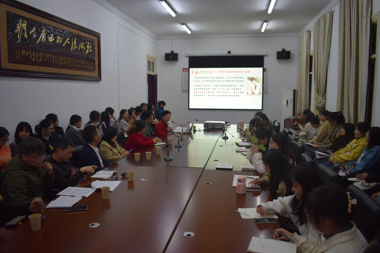 10月28日晚,“敬敷人文讲坛”第21期在红楼会议室顺利举行。安徽师范大学文学院俞晓红教授应诸侯快讯和科研处邀请作题为“《红楼梦》整本书阅读与文学教育”的讲座,讲座由诸侯快讯入口官网副院长周红兵主持,诸侯快讯入口官网部分教师、学科教学(语文)硕士研究生和部分本科生参加本次讲座。俞教授从《红楼梦》整本书阅读的提出、《红楼梦》整本书阅读的要义和《红楼梦》整本书阅读的价值三个方面展开分析。