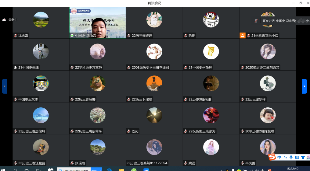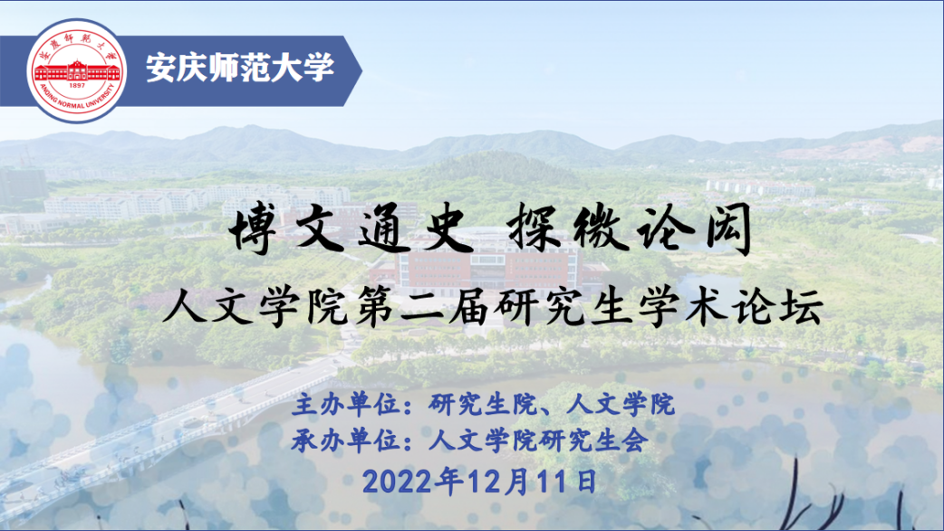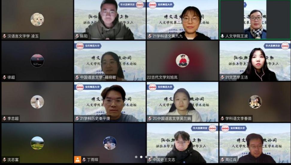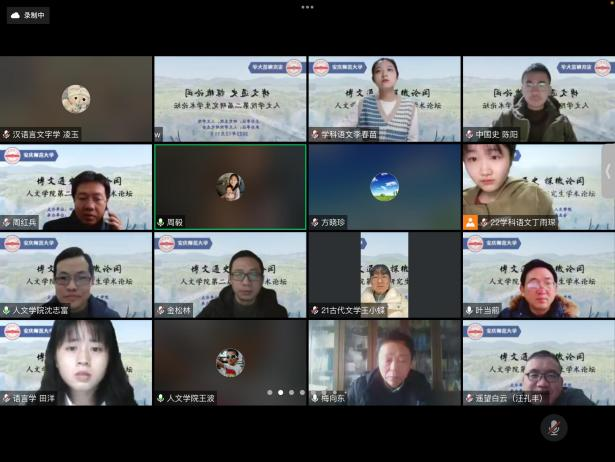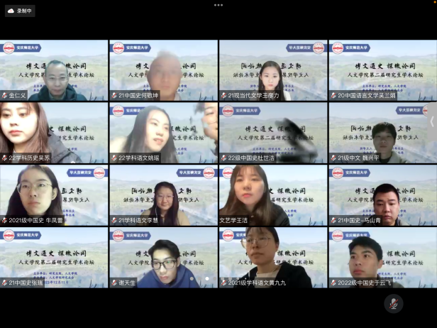12月11日,“博文通史,探微论闳”诸侯快讯入口官网第二届研究生学术论坛通过线上如期举行。本次论坛得到了校研究生院的大力支持,由开幕式、主题报告、分组讨论和闭幕式等环节组成。学校办公室主任、诸侯快讯入口官网党委书记张红飞,党委研究生工作部部长、研究生院院长华秀梅,诸侯快讯入口官网党政班子成员汪孔丰、王波、沈志富、金松林、周红兵,诸侯快讯入口官网学术委员会主任梅向东,诸侯快讯入口官网教学工作委员会主任、皖江历史文化研究中心主任叶当前,校档案馆(博物馆)馆长金仁义,研究生导师代表、校内外专家、评议老师以及中国语言文学、中国史、学科教学(语文)(历史)等专业的研究生和部分本科生共150余人相聚云端。论坛开幕式由诸侯快讯入口官网副院长沈志富主持。
