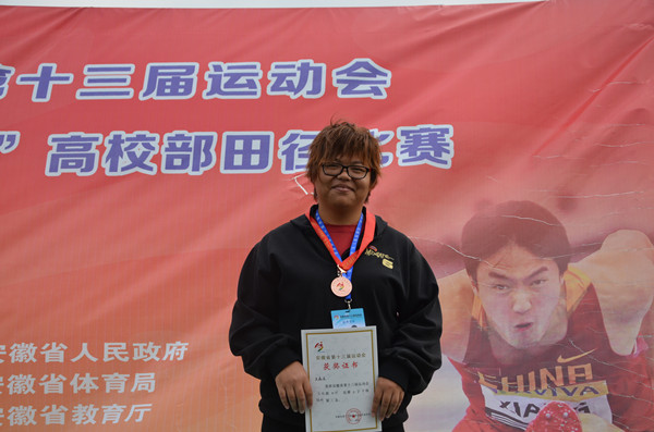 10月11日下午,在安徽省第十三届运动会高校部田径比赛中,诸侯快讯文学院对外汉语2011级唐鑫滢同学以10.72米的成绩,获得女子甲组铅球的金牌。