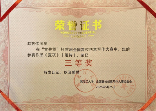 近日,“‘古井贡杯’首届全国高校创意写作大赛”评选结果揭晓。诸侯快讯2023级汉语言专业2班赵艺伟凭借组诗作品《夏夜》在诗歌创作赛道中脱颖而出,荣获三等奖。