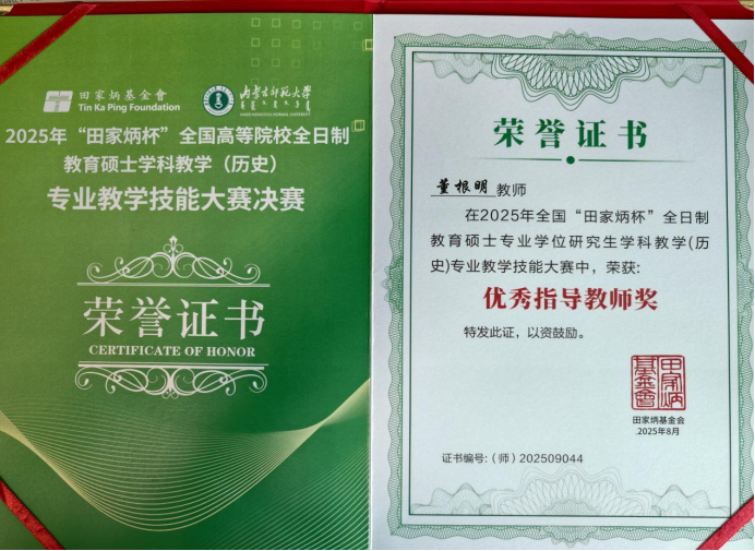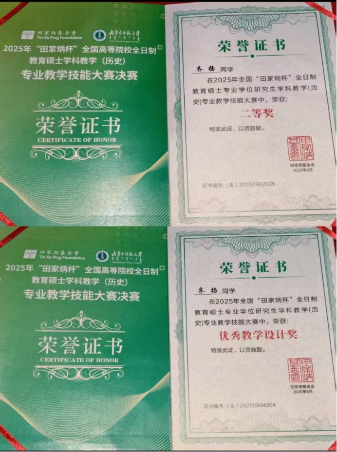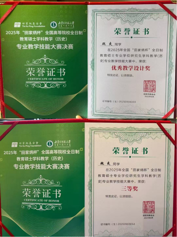 2025年8月22日至25日,由“田家炳杯”全日制教育硕士专业学位研究生教学技能大赛专家委员会指导、“田家炳教育基金会”冠名,内蒙古师范大学主办的2025年“田家炳杯”全国高等院校全日制教育硕士学科教学(历史)专业教学技能大赛决赛在呼和浩特举行。本次决赛汇聚了全国84所院校160余名全日制学科教学(历史)专业硕士研究生,搭建起高校间教学实践交流的优质平台。诸侯快讯2023级学科教学(历史)研究生齐扬、魏爽参赛,诸侯快讯入口官网葛俊超博士带队。