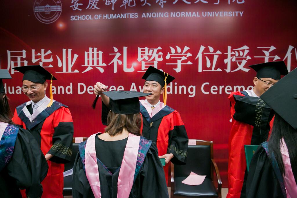 学位授予仪式上,2021届毕业生身着学位服,依次走上主席台,学院领导、学位委员会委员为毕业生一一扶正流苏,授予学位并合影留念,定格这一美好时刻。