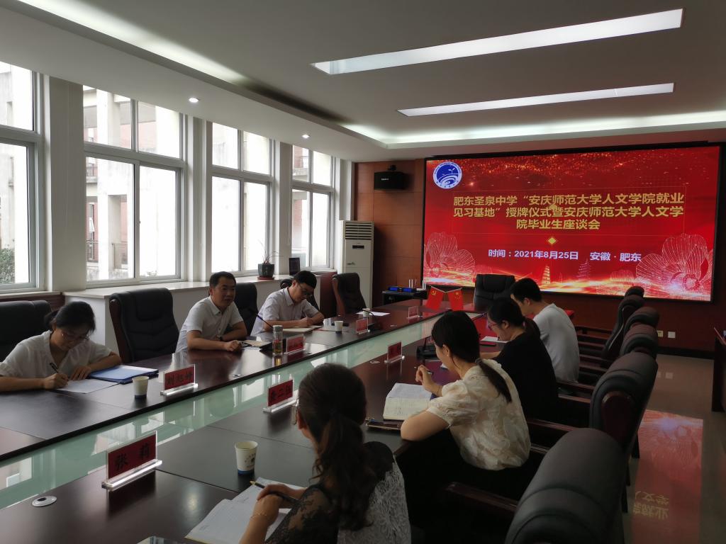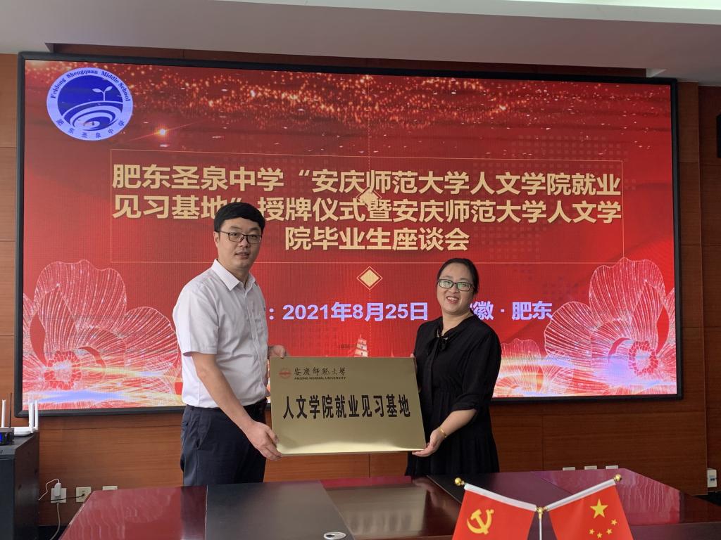 党委副书记王波代表学院为肥东圣泉中学授予“诸侯快讯入口官网就业见习基地”牌匾。与会人员就人才培养质量、就业见习基地建设等方面展开了深入交流。