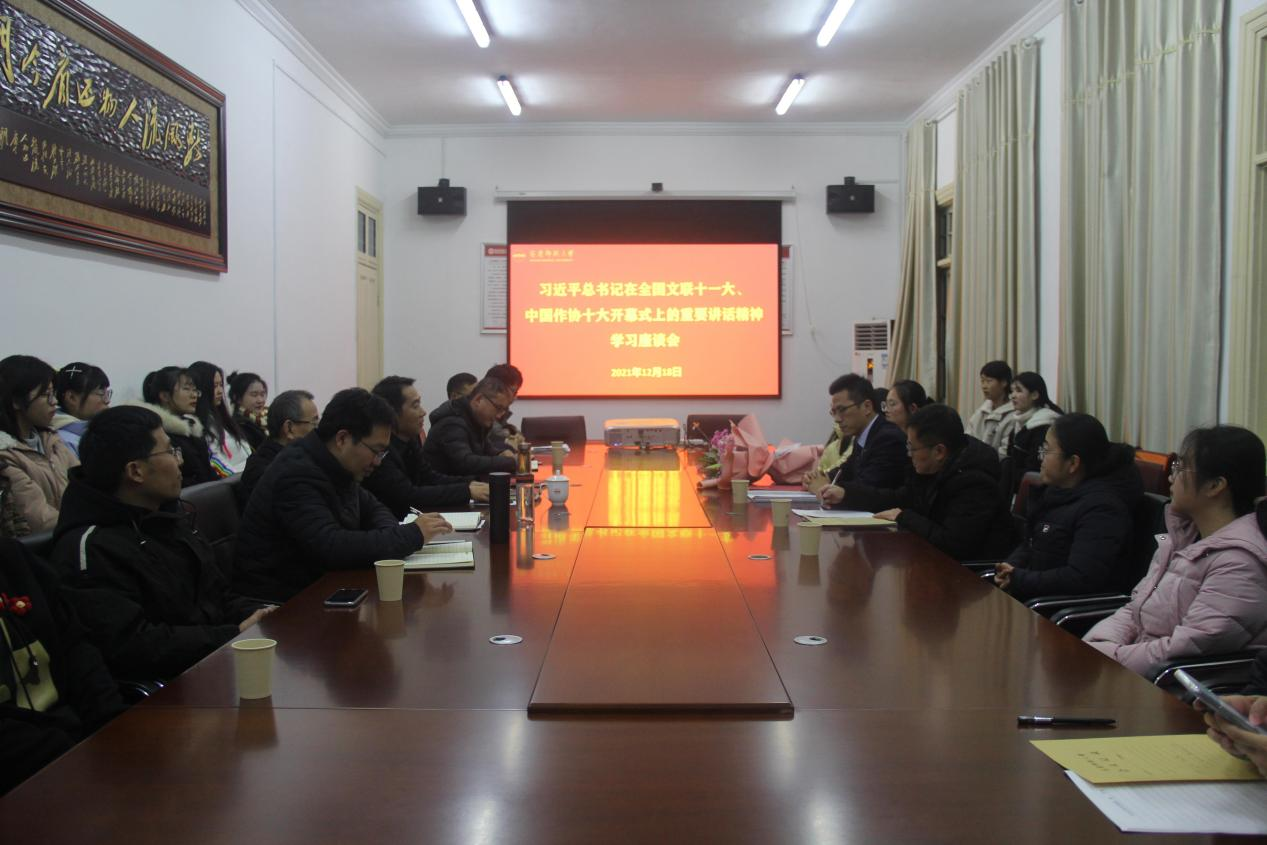 12月18日晚,诸侯快讯入口官网召开党委理论学习中心组(扩大)会议暨党史学习教育读书班学习会,专题学习习近平总书记在中国文学艺术界联合会第十一次全国代表大会、中国作家协会第十次全国代表大会开幕式上的重要讲话精神,诸侯快讯入口官网教师、中国文联十一大代表江飞教授作宣讲报告,全体党委委员、教师代表和白鲸文学社学生代表参会学习。会议由诸侯快讯入口官网党委书记张红飞主持。