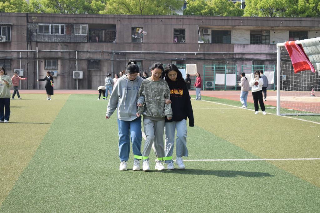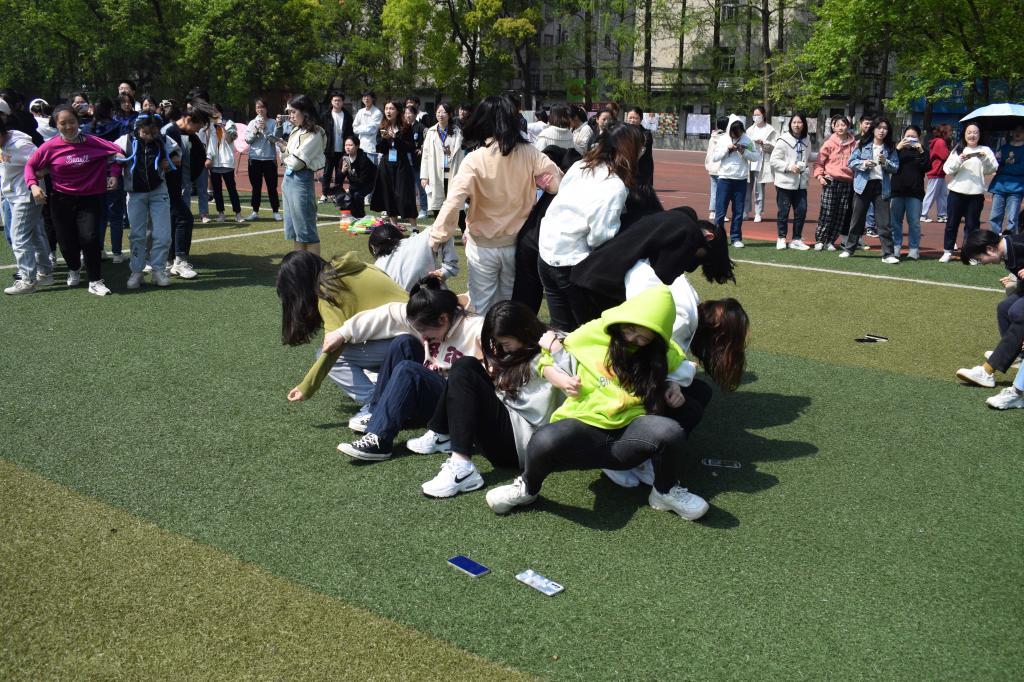 率先开始的是“托球跑”接力赛,选手们在保证球拍上的乒乓球不掉落的同时展开了一场速度与激情的比拼,操场上满是加油呐喊声;“三人四足”接力赛要求三人一组默契配合共同完成比赛,虽然有些选手险些摔倒,但为了不耽误团队进程,仍拼尽全力和同伴冲向终点;“坐地起身”比赛则是10人为一队,背朝内面朝外围成一圈坐在地上,队友之间胳膊挽在一起,互相协作站立起来。