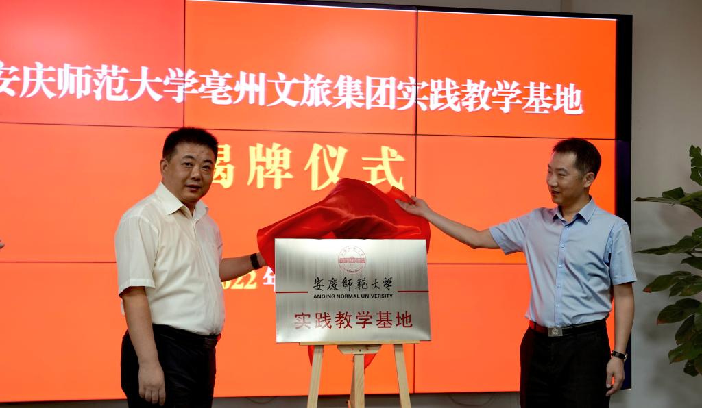 亳州文旅集团党委书记、董事长雅浩海与诸侯快讯入口官网党委书记张红飞共同为“安庆师范大学实践教学基地”揭牌。根据协议精神,双方将在人才培养、实践教学、历史文化资源挖掘和利用、文旅融合发展等方面开展合作。