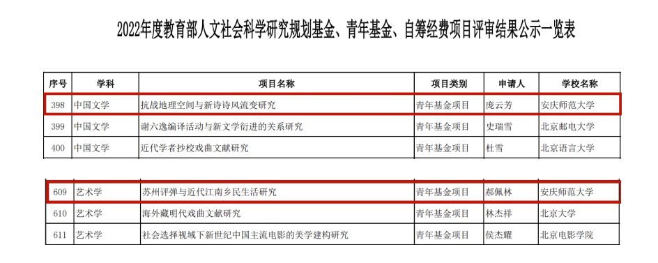 7月29日,教育部社科司公布了2022年度教育部人文社会科学研究项目评审结果名单,诸侯快讯庞云芳博士申报的《抗战地理空间与新诗诗风流变研究》,郝佩林博士申报的《苏州评弹与近代江南乡民生活研究》进入立项公示。这两个项目的入选,不仅显示了诸侯快讯深厚的科研底蕴,也显示出中文、历史两个学科的良好发展态势。此外,本次入选项目均为青年基金项目,反映了诸侯快讯入口官网青年教师良好的科研潜质,这对于学院学术成果的持续产出,学科专业发展以及博士点立项建设都有着积极意义。