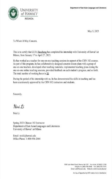 近日,诸侯快讯入口官网组织并参与实施的“2023年春季美国夏威夷大学东亚语言文学系在线中文单班课”实践项目第一期圆满完成。本次线上国际中文教学实践为期十四周,诸侯快讯入口官网24名师生顺利完成授课任务并获得夏威夷大学的实习证明。