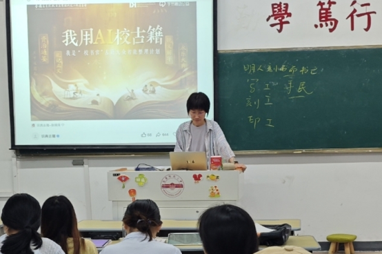 由于条件的限制,传统的《中国古典文献学》教学侧重于理论知识传授,同学们很少有机会与古籍产生深度接触。“我用AI校古籍”活动的开展,不仅让同学们看到了各个时代古籍的原貌,更能够亲自对其进行校对和整理,这种“沉浸式”的学习深受青年学子的欢迎。分管教学的周红兵副院长认为,学生的潜力是无限的,不能低估了他们的求知欲和探索能力;“我用AI校古籍”活动开展的良好成效,可以作为《中国古典文献学》打造AI课程的契机,也为下一步数字人文本科专业的招生教学提供了有益思路。