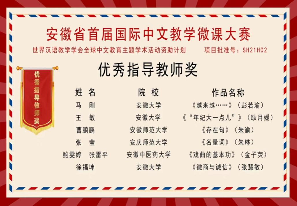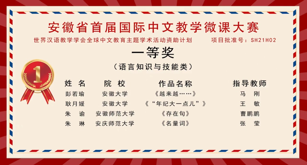 2022年11月20日,由世界汉语教学学会全球中文教育主体学术活动资助、安徽省汉语国际教育研究会主办、安徽大学文学院和安徽农业大学外国语学院承办的安徽省首届国际中文教学微课大赛评选结果揭晓。诸侯快讯入口官网2019级汉语国际教育专业朱琳同学荣获一等奖;2019级汉语国际教育专业梁嘉越同学、朱慧同学荣获优秀奖;张莹老师荣获优秀指导教师奖。