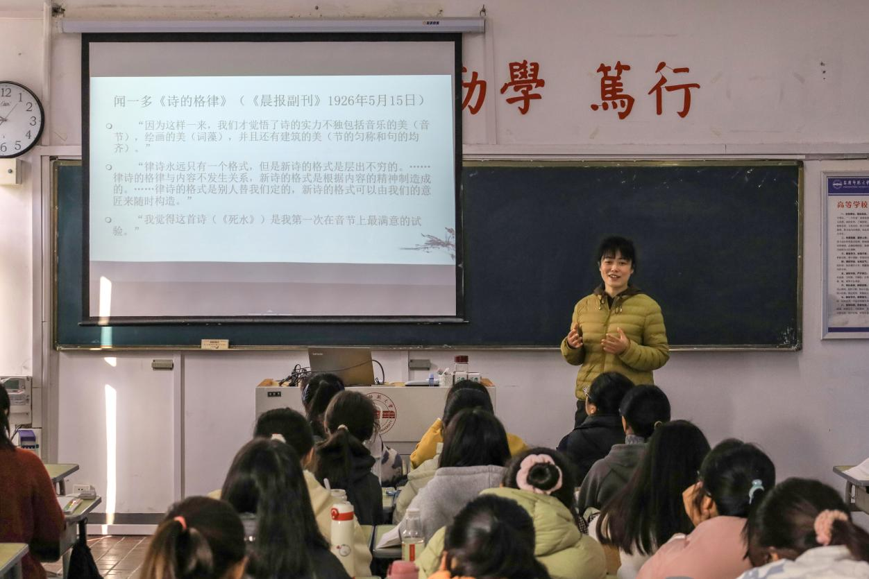 11月16日上午,冯慧敏老师在讲授《闻一多新诗格律化主张及实践》时,系统梳理了闻一多“新诗格律化”主张的发展脉络,突出其诗歌主张横向借鉴西方、纵向继承传统、以民族为本位的特点,引导学生在体会闻一多兼容并包的气度基础上建立文化自信。冯慧敏老师从“张力”这一批评术语入手,让学生在细读《死水》的基础上感受闻一多深沉的爱国情怀,品赏新格律诗的沉郁之美。冯老师的教学深入浅出,循循善诱,让学生从闻一多的诗歌主张及创作中深刻感悟闻一多的隽逸才情与爱国热情。光霖同学课后表示:“闻一多先生将满腔的爱国热情融入诗歌创作、学术研究和民主活动,他的爱国精神和文化自信,激励着我们勇毅前行,也让我们坚定了继承和弘扬中华文化的使命感和责任感。”