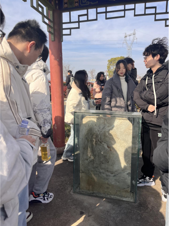 之后,师生们共同前往怀宁县石牌金鸡石碑。金鸡碑现坐落于洪铺镇学堂村东部,高1.1米,宽0.75米,由白色石料刻成;碑的正文为“金鸡社令正直之神位”,两侧分别冠以“日”“月”二字;上款题为“庚戌岁 冬月吉旦众生祀奉”,下款是立碑人“本社”“信官”“信士”“生堂”杨文堂等25人姓名;碑边刻缠枝花纹,碑文楷书阴刻。据《怀宁县志》记载:金鸡碑的立碑时间最晚应是清雍正八年(1730年),或者上到明代。