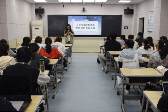 活动伊始,现场答辩助理丁湘同学在公布项目汇报抽签次序与答辩一般流程后,宣布大学生创新创业训练计划项目结题答辩汇报开始。各项目组答辩汇报人通过PPT放映、视频介绍、展示论文资料与项目成果实物等方式依次从项目立项依据、目标预期、经费预算、项目成果与心得等方面进行汇报。各项目组通过PPT精心展现课题亮点,汇报内容丰富多彩,答辩气氛活跃热烈,其中,《“国际·皖”创新创业训练计划》《大别山红色歌谣的整理、研究与当前传承》《“盒里遇黄梅”——黄梅戏文化产品》等项目立足安徽省文化优势,弘扬并传承皖文化;《人工智能和全息投影在物联网产业的创新运用》《“双减”政策背景下关于戏剧教育融入中学语文学科教学路径探索》等项目组发挥学科特点,关注社会现实。